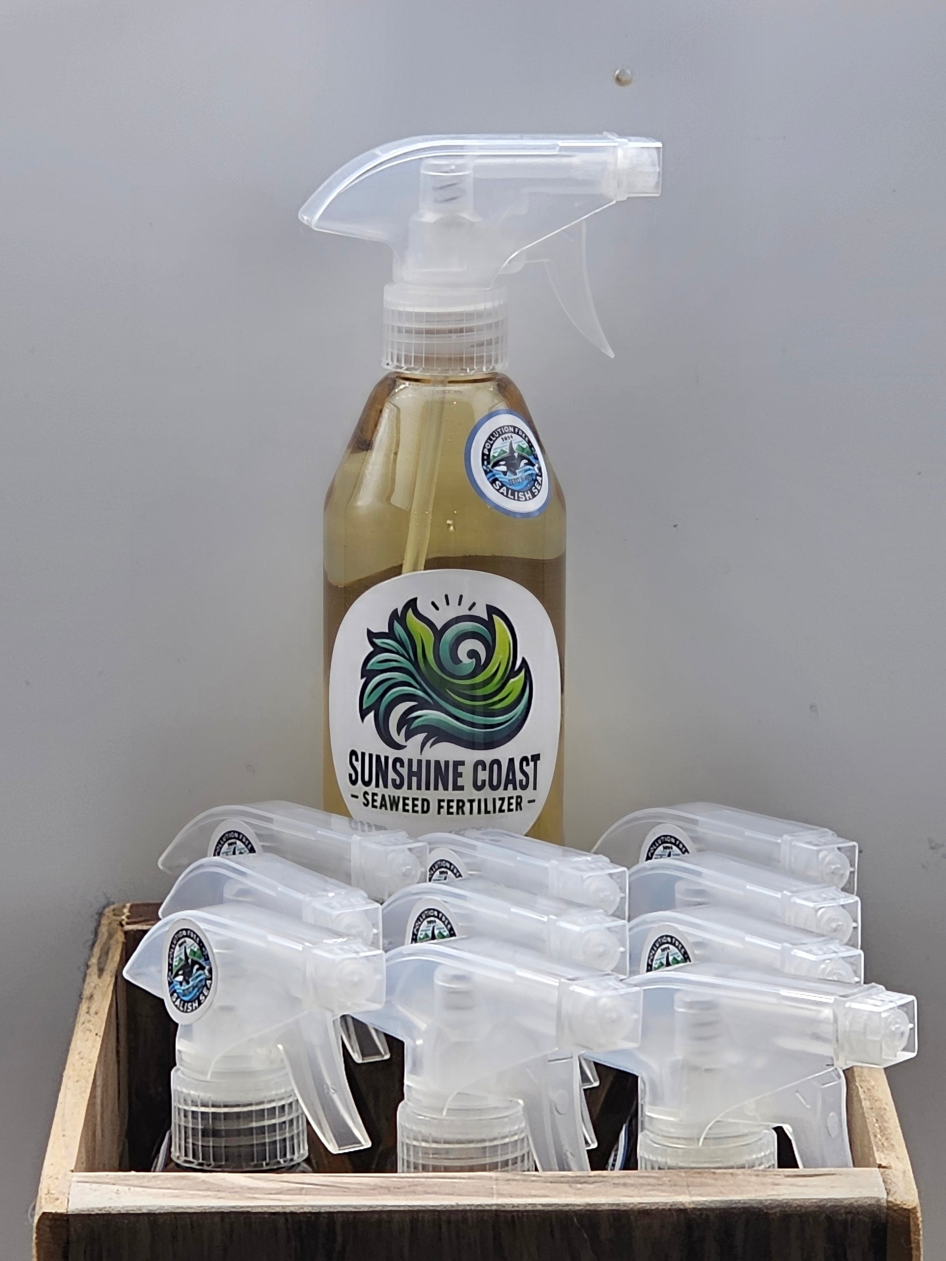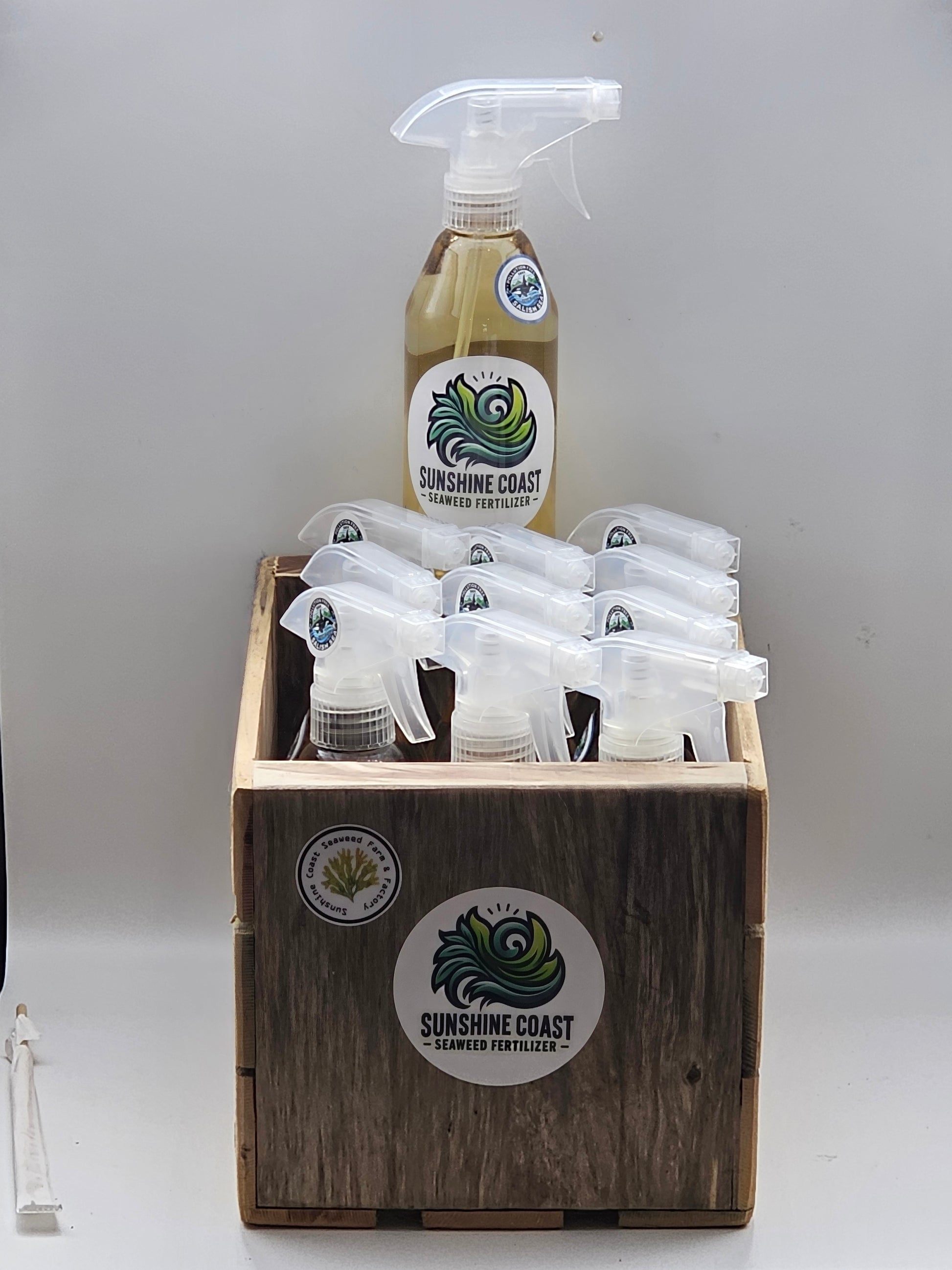 Bring the ocean’s natural power to your shelves with Sunshine Coast Seaweed Fertilizer. Packaged in convenient spray bottles and presented in a rustic wood display crate, this product combines premium performance with eye-catching presentation.